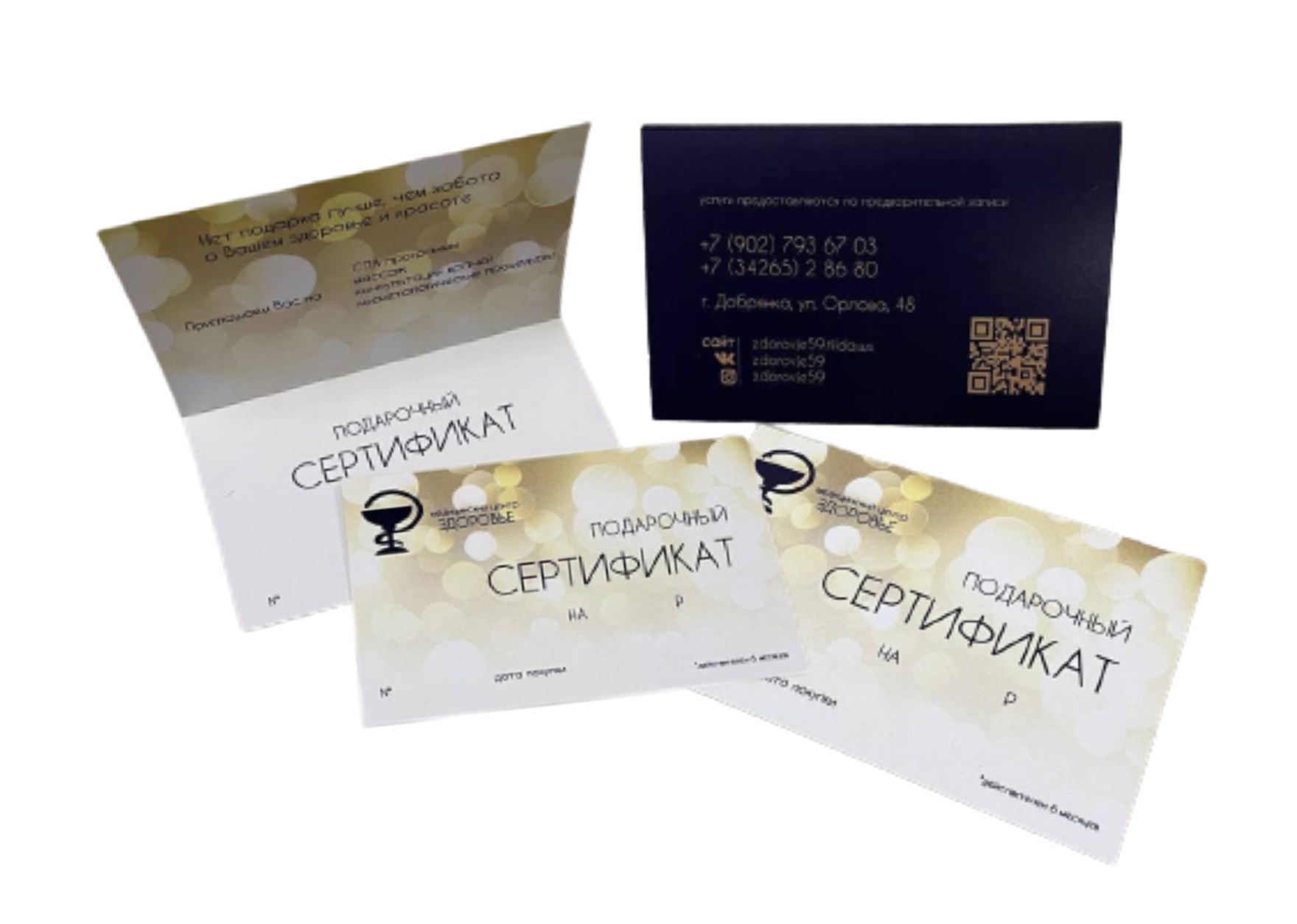 Забота о здоровье - самое ценное, что можно подарить близким. В нашем медицинском центре имеются сертификаты любого номинала, которыми можно воспользоваться для оплаты услуг.